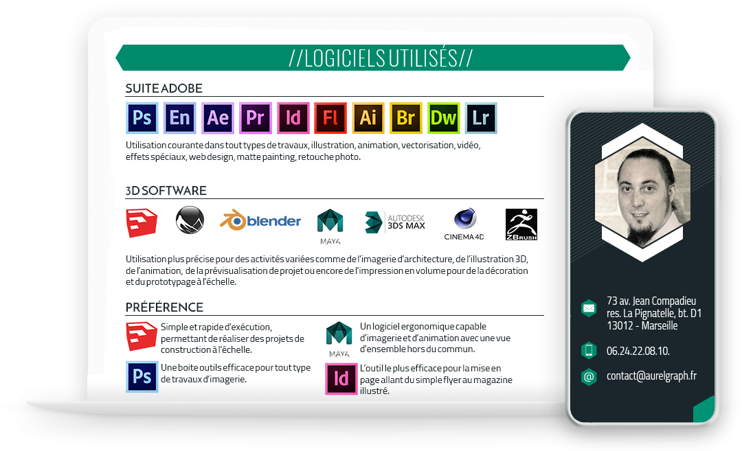 Photoshop, Illustrator, Flash, Indesign, Maya, Autocad, 3Ds Max, Cinéma4D.